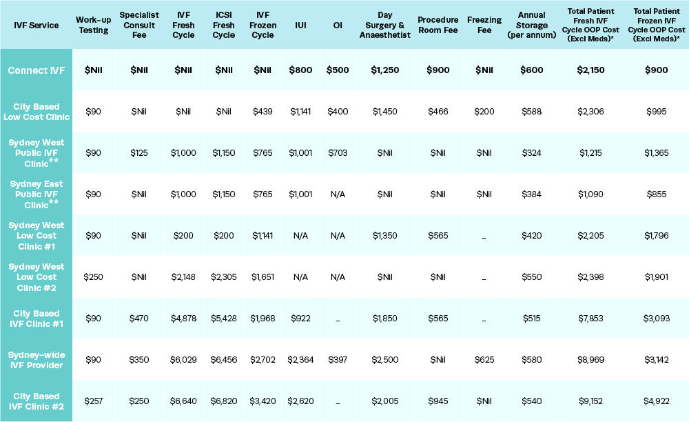We've put together the below IVF clinic cost comparison by fertility treatment and by total costs.